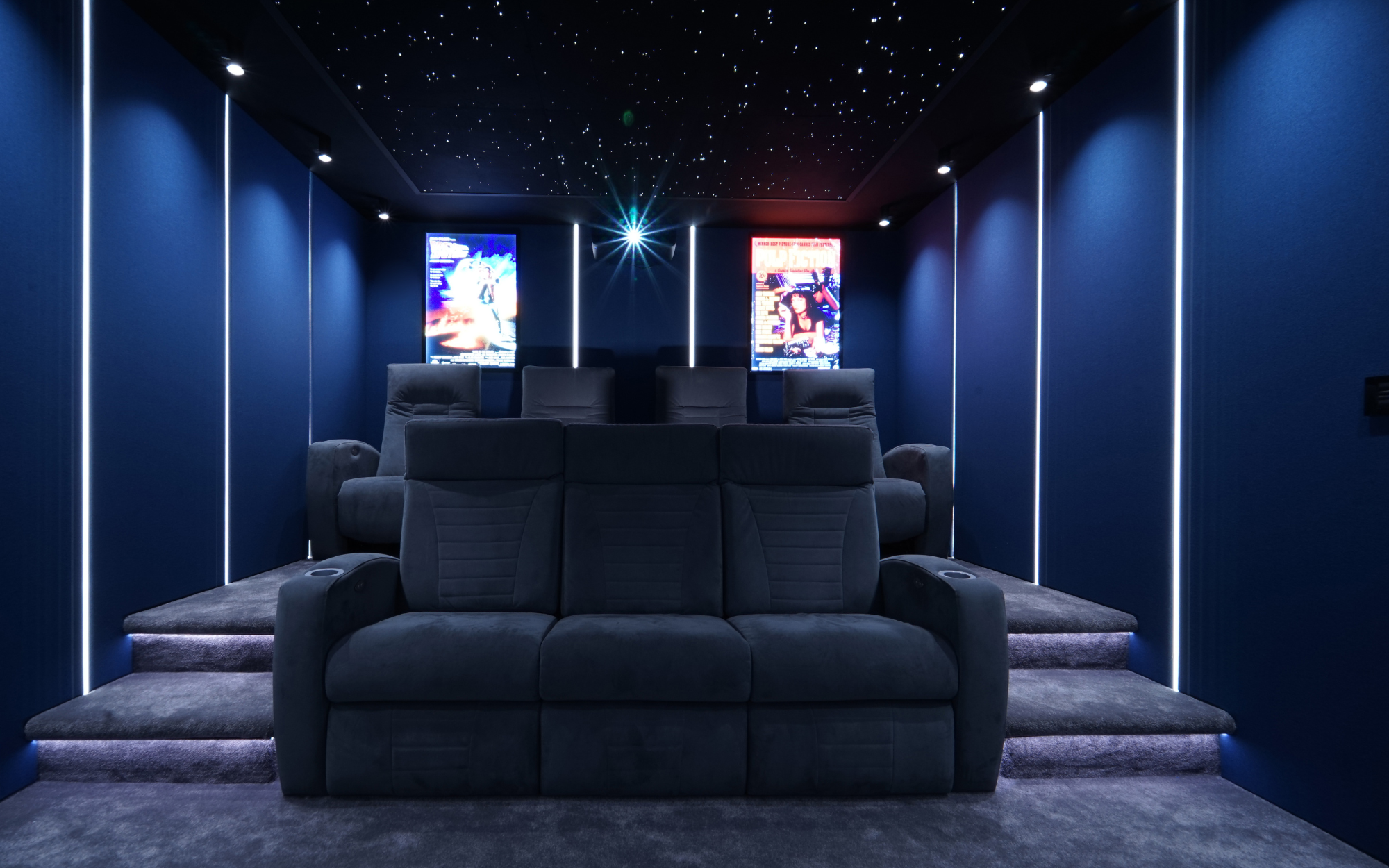 The Meridian system was installed alongside a Sony laser 4k projector, custom cinema seating in luxurious alcantara fabric, acoustic fabric walls, a star ceiling, plush carpet, and LED lighting features, all seamlessly automated by Control4 automation. The project was finalised with illuminated cinema lightboxes showcasing iconic film images, adding the perfect finishing touch to the cinematic theme.